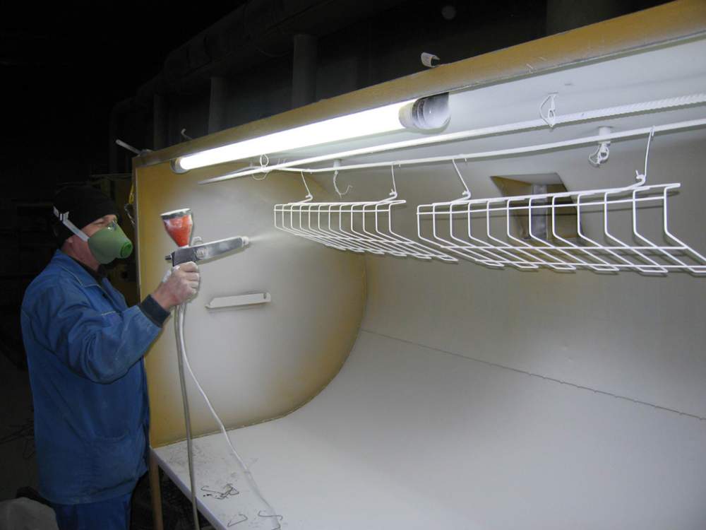 O segredo é que, apesar da pressão bastante alta que o compressor libera, o pó é expelido da pistola muito lentamente e a pintura ocorre a uma curta distância do metal, o que impede que a tinta escape em diferentes direções. Se falamos de oficinas especializadas, o revestimento em pó de estruturas metálicas é realizado em câmaras seladas, com ventilação especial e um sistema de filtragem.
