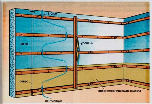 A estrutura de uma barra ou um perfil de metal é montada de maneira semelhante. É melhor usar quando as paredes da sala são muito curvas ou se você precisar colocar uma camada de isolamento térmico sob a pele. Esse design permitirá que você faça o recuo necessário da parede.