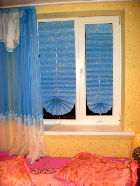 Dos restos de papel de parede denso, por exemplo, vinil (consulteVamos considerar como os papéis de parede de vinil diferem dos papéis.), você pode fazer outro tipo de cortina para janelas.