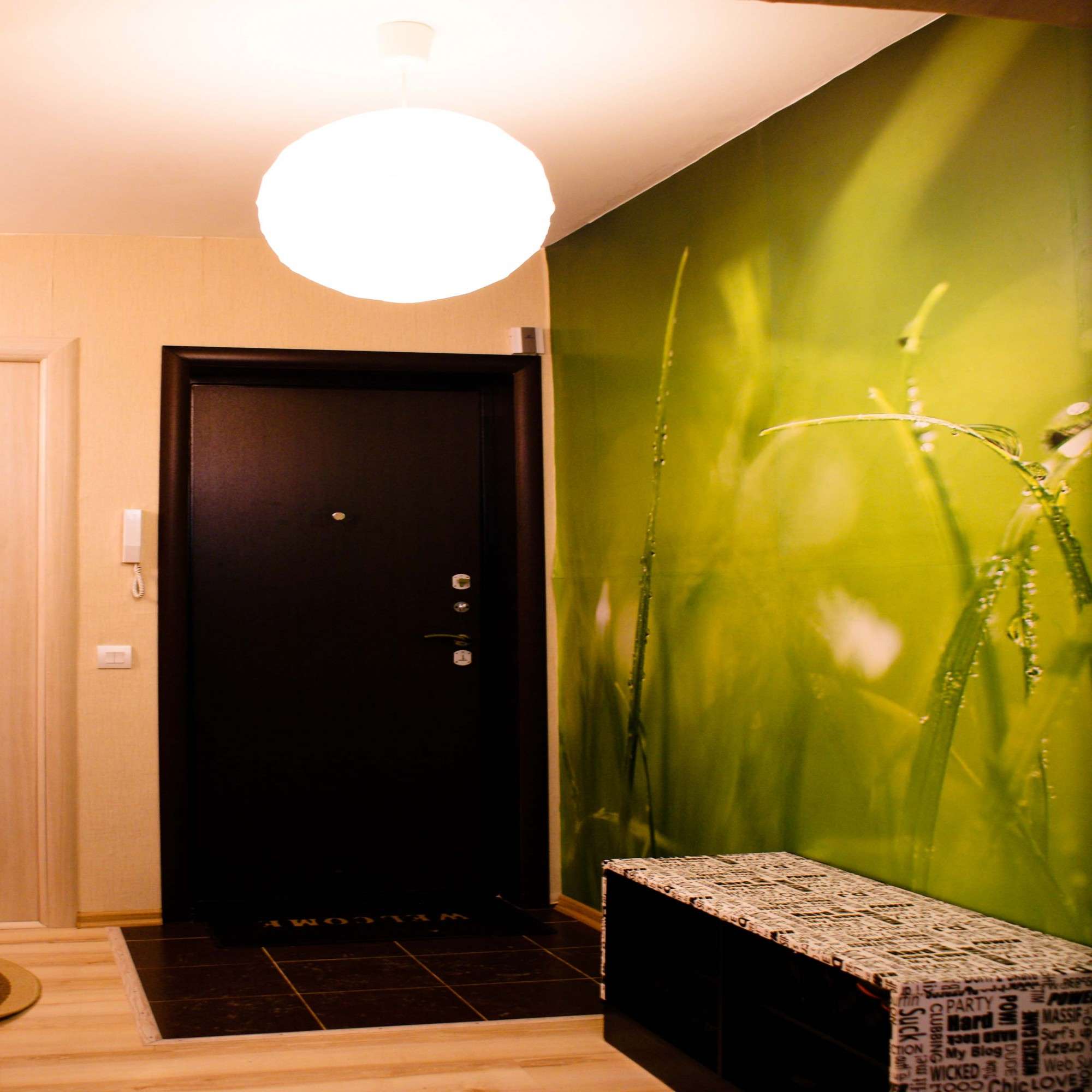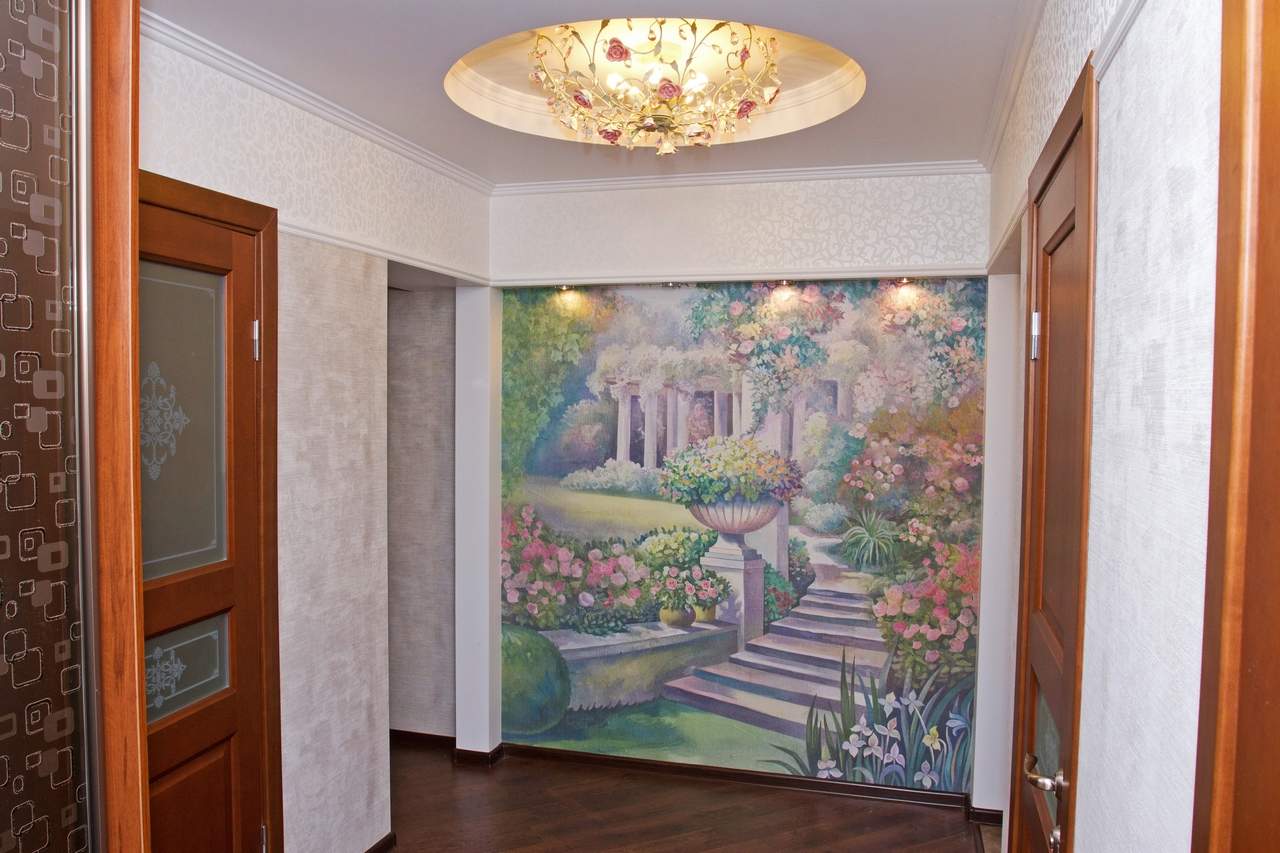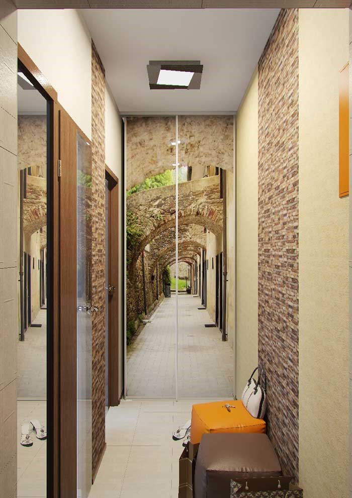 - O tema da imagem deve corresponder a todo o estilo do interior e design da sala e até do apartamento, pois a partir do corredor você pode entrar em quase todos os quartos.