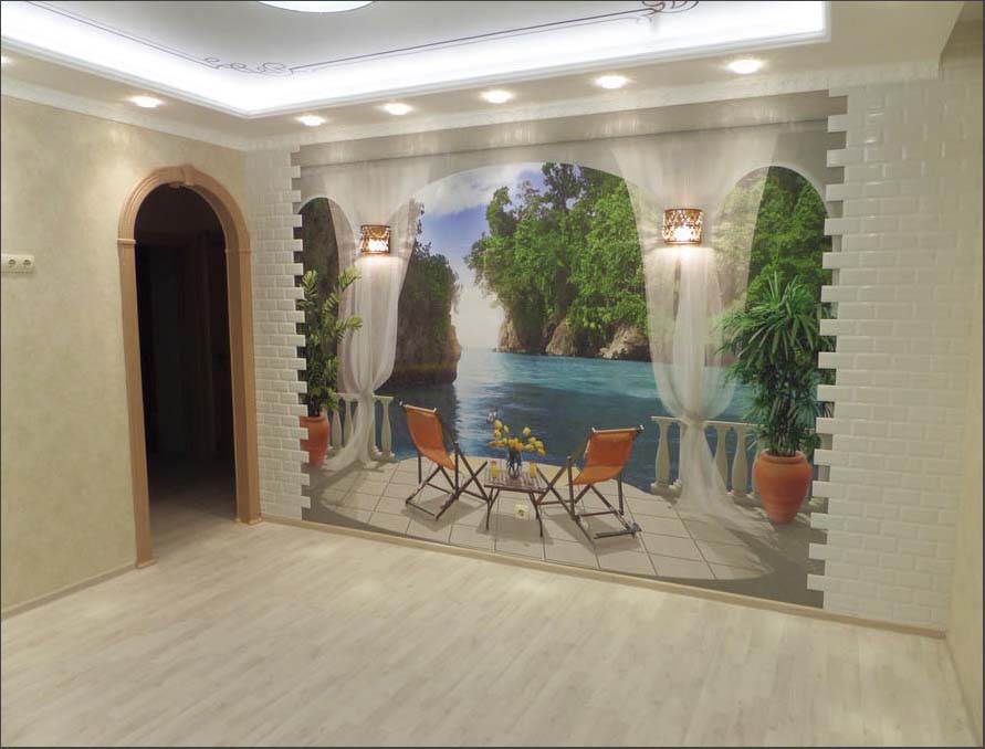 Você pode criar uma orientação estilística no salão escolhendo a imagem necessária e adequada no papel de parede da foto. Se você já tem o estilo do interior da sala, pode enfatizar a decoração da parede no corredor estreito, a imagem do papel de parede da foto.