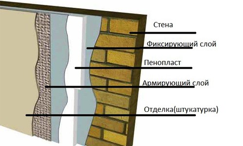 - Protege a espuma contra danos mecânicos. Provavelmente todo mundo sabe que o poliestireno é um material muito frágil: você só precisa se apoiar nele, assim que um dente aparecer. E se você acertar, você terá um buraco. Assim, o gesso será uma camada externa adicional, uma barreira que pode proteger a espuma de numerosos danos.