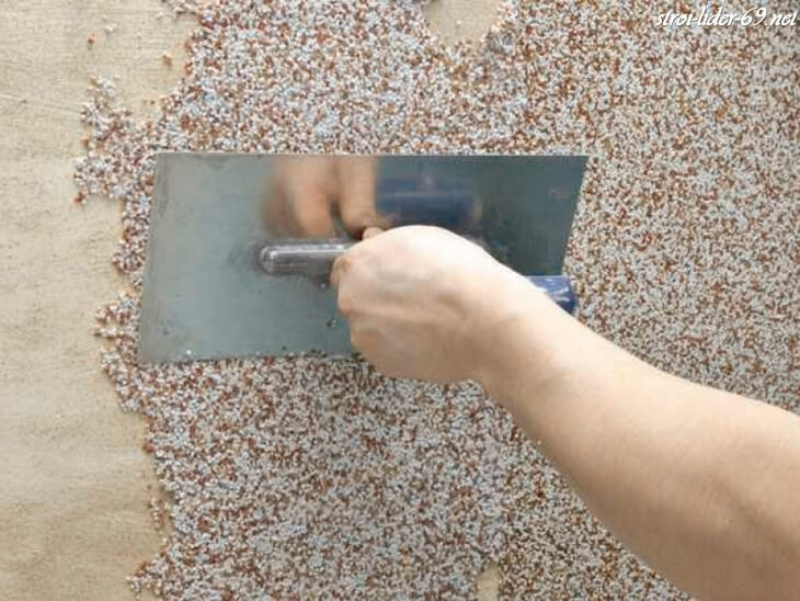 - Primeiro pegamos uma ampla espátula e então é aplicado um reboco decorativo de granito com uma espátula menor. Depois disso, a composição é esfregada uniformemente ao longo da parede, cuja camada é igual à espessura da fração de uma unidade de mármore.