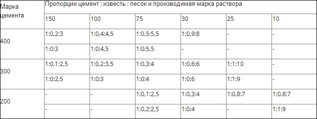 Componentes e proporções usadas: mistura de cal, cimento, areia para construção - 1: 1: 2–5.