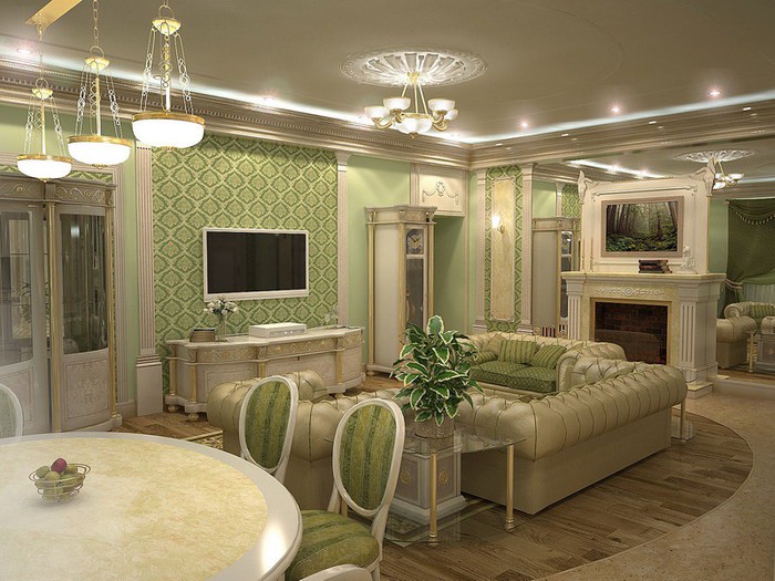- Você pode combinar o papel de parede nas paredes com tinta ou gesso decorativo. Especialmente se a sala for grande e você precisar dividi-la em zonas, ou apenas livrar a superfície das paredes da monotonia.