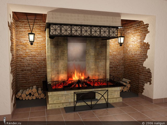 - E aqui está outra lareira - no interior da sala, decorada em estilo mediterrâneo. Só agora, a parede é confrontada com tijolos decorativos com um relevo "de pedra".