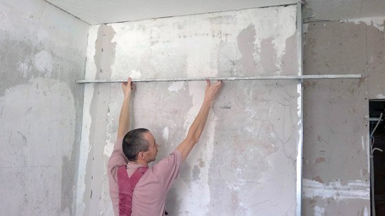 Pointe. La façon la plus simple de détecter les irrégularités est à l'aide d'une longue règle appliquée au mur, et entre elles, elles sont éclairées par une lampe de poche.