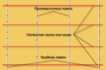 Le marquage et l'installation sans erreur des phares est non seulement l'étape la plus difficile des travaux de finition, mais aussi la plus importante. À ce stade, déterminez quelle épaisseur appliquer la couche de plâtre et, conformément à cela, réglez les niveaux strictement verticalement et horizontalement pour niveler le mélange fini.