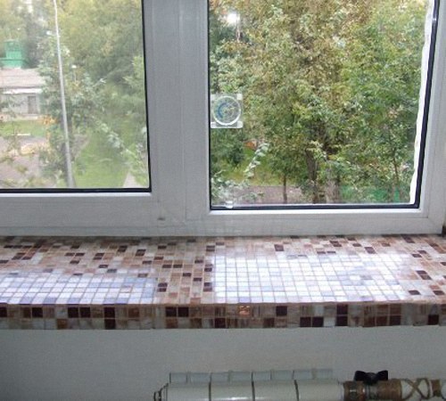 Ne yazık ki, bu seçenek herkes için uygun değildir, ek olarak, iç mekanı değiştirmek istiyorsanız, çok fazla para için üzüleceksiniz. Ancak, neme dayanıklı bir dayanıklı neme dayanıklı malzemeden yapılmış ve porselen taş veya mozaikle süsleyerek pencerenin alt kısmını orijinal bir şekilde tasarlamanın başka bir yolu var.