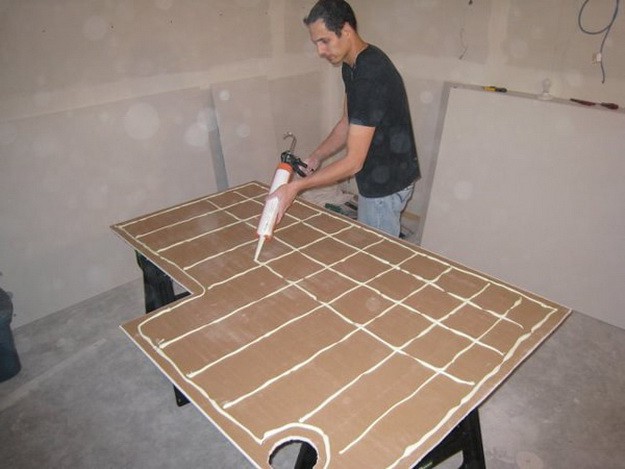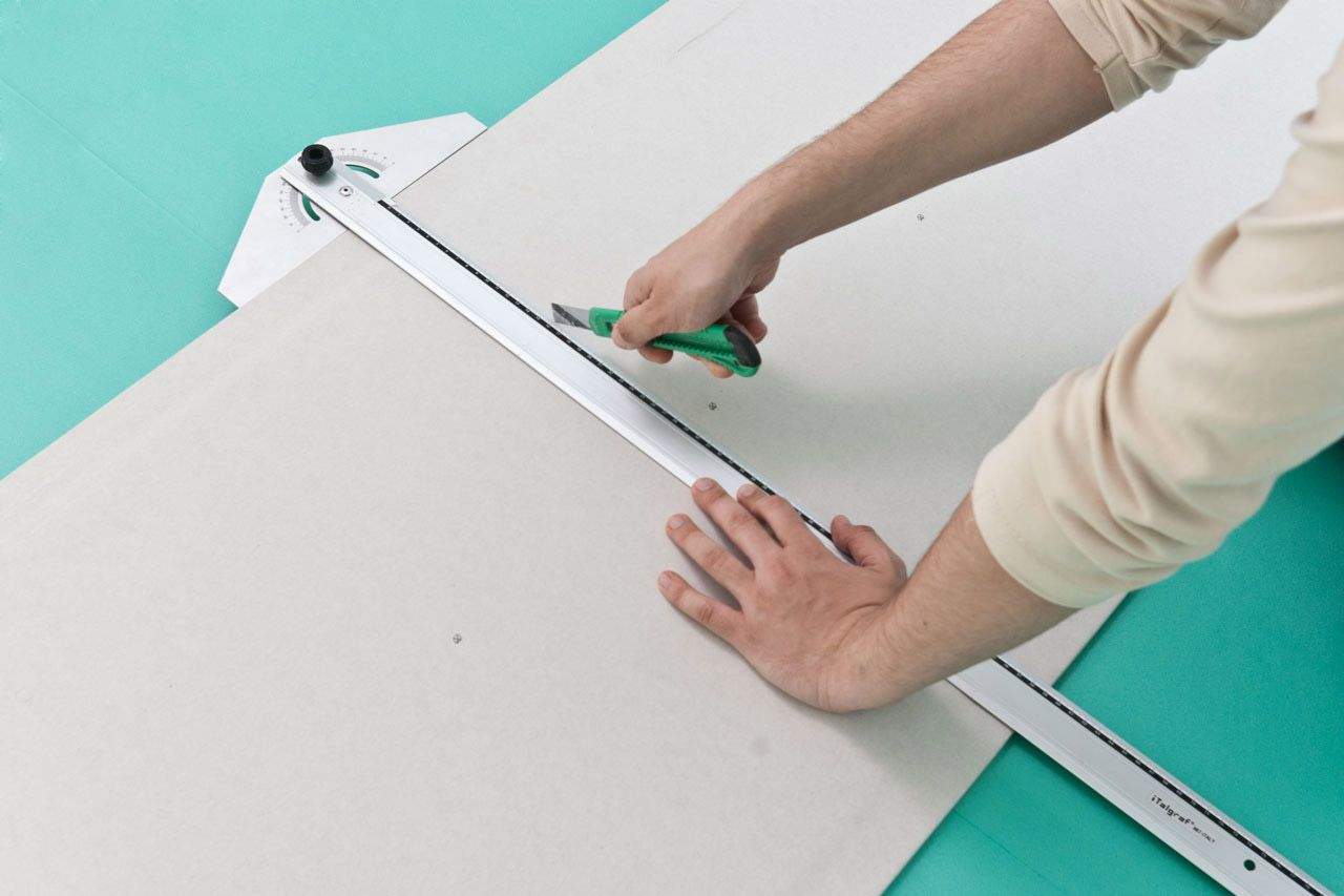 Her şeyden önce, alçıpan levhaları ihtiyacımız olan boyuta kadar kesiyoruz. Bunun nasıl yapılacağı web sitemizdeki makalelerden birinde ayrıntılı olarak açıklanmaktadır, bu yüzden tekrar etmeyeceğiz ve hemen yapıştırıcı uygulamaya devam edeceğiz.