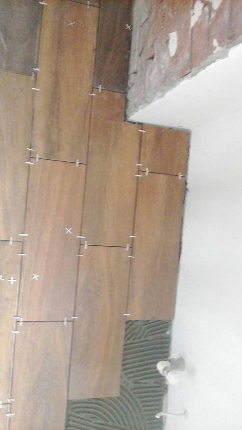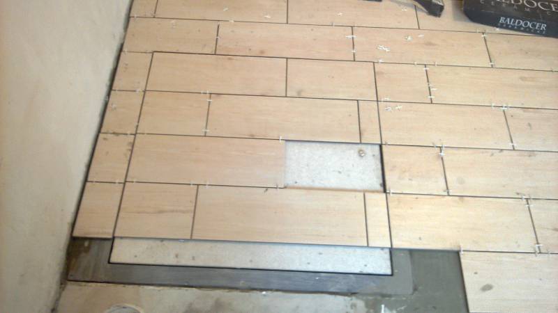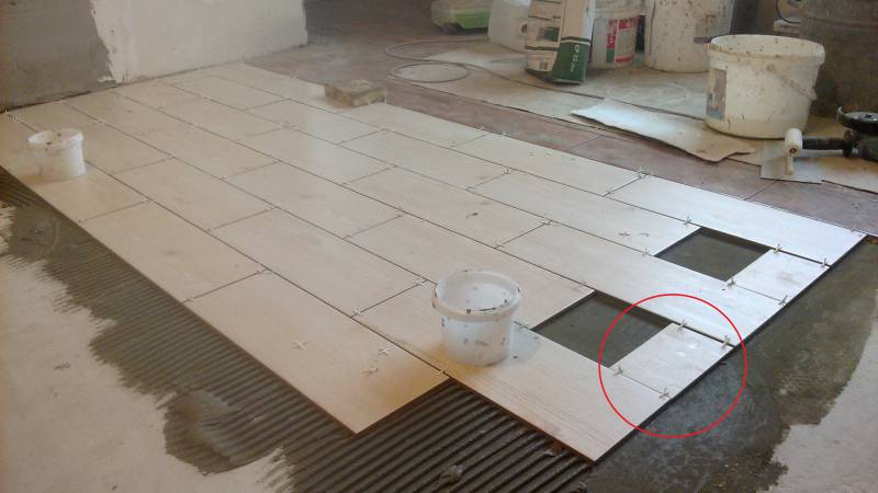 Dikişlerin düzgünlüğünü kaçırmamak için, haçların takılı olduğu, ancak kaçırılan karonun yerine tutkalsız dar bir karo ekinin döşenmesi önerilir. Bu teknik bir sonraki fotoğrafta çok daha iyi görülüyor.