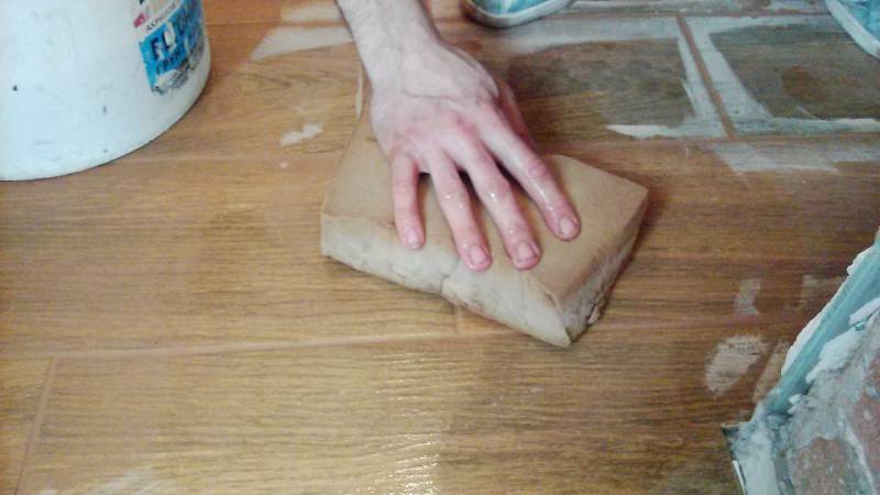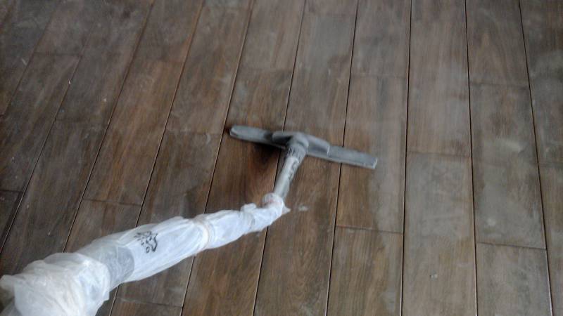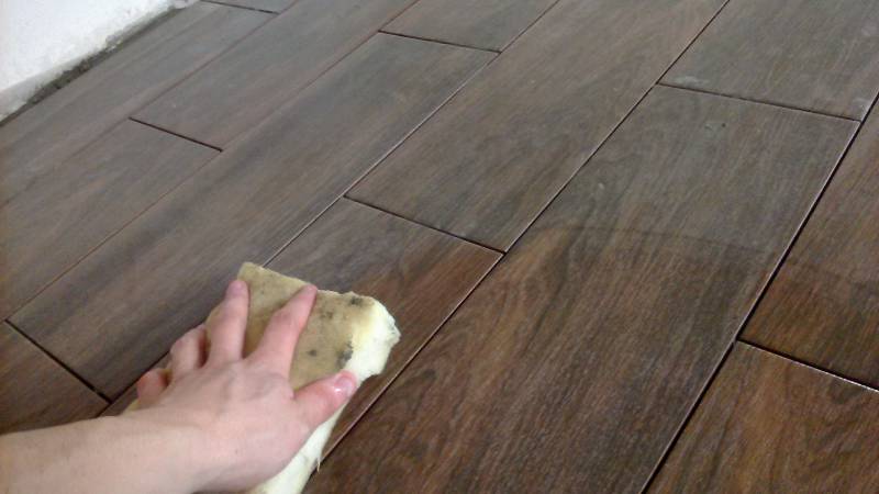 Bir süpürge ile çalışmak da mümkündür, ancak ondan sonra, aksine dikişler tozla tıkanır, bu yüzden özel bir dikkatle süpürün. Sonunda, zemini, karo yüzeyinde kurumuş olan küçük tutkal izlerini kolayca kaldıran nemli, yoğun bir süngerle yıkamanız gerekir.