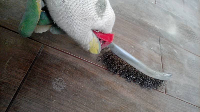 Karonuzun koyu bir rengi varsa ve çiziklerden korkmuyorsa, bu işlemi hızlandırmak için sert bir metal fırça kullanın. Temizledikten sonra, zemindeki tüm kirleri temizlemeniz gerekir. Bunu yapmak için, dikişlerden bile tozu temizleyen bir elektrikli süpürgeye ihtiyacınız vardır.