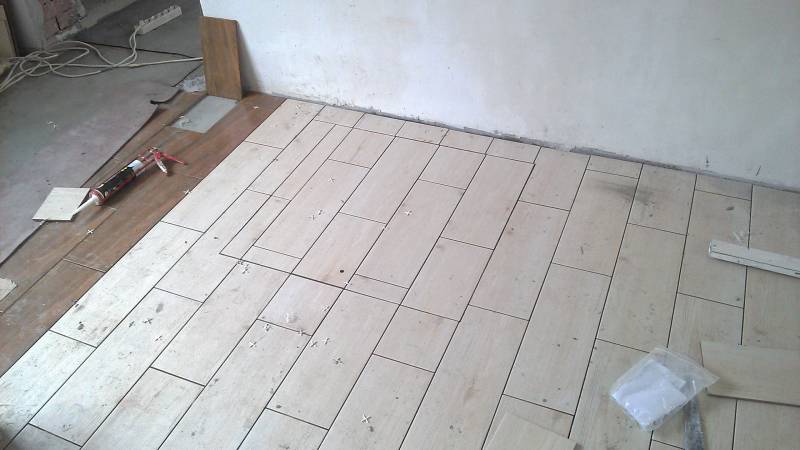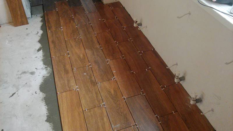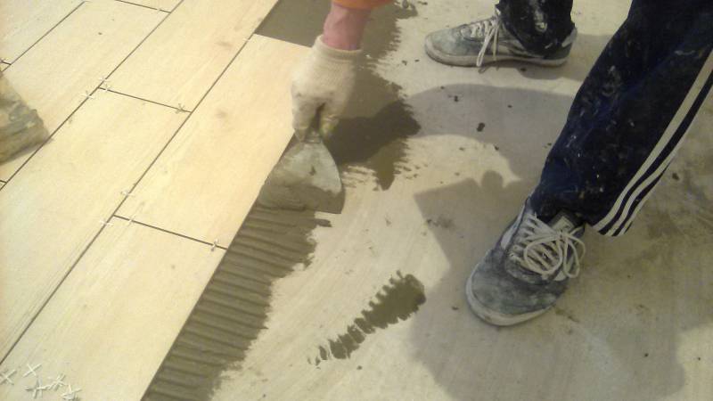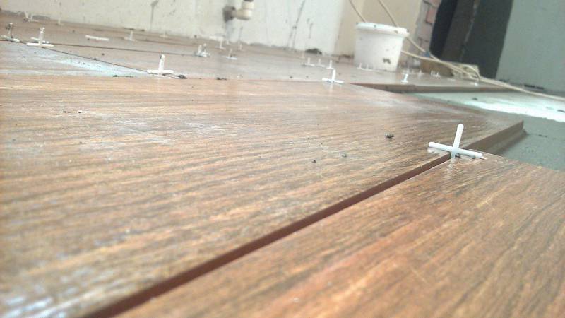 Ayrıca, kademeli bir şekilde, haçlar oluşturmayı unutmadan, safları rapor ediyoruz. Döşemenin farklı bir genişliği vardır.Bu durumda, dikişin genişliğini ayarlamak için kamalar kullanılabilir.