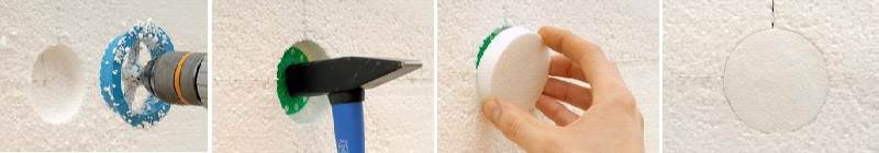 - Şemsiye ortaya çıkan deliklere yerleştirilir, daha sonra kauçuk küçük bir çekiç yardımıyla sonuna kadar dövülür. Ayrıca plastik çiviler çiviler. Şemsiye başları özel bir karışımla ovulur, böylece görünmezler.