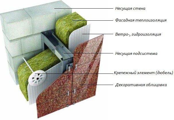 On ne peut que mentionner un tel concept de façade ventilée. Son essence réside dans le fait qu'un coussin d'air est créé entre le revêtement et la couche isolante, ce qui empêche l'humidification de l'isolation et la formation de condensation sur la surface intérieure du revêtement.