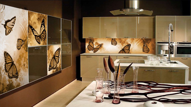Je n'avais jamais entendu parler de ce genre de finition auparavant, comme un skinhead. La première chose qui m'est venue à l'esprit est très pratique. Le verre n'absorbe aucune impureté, est facile à nettoyer et donne une surface exceptionnellement plate. Et à propos de la variété des dessins et des schémas de couleurs, il n'y a rien à dire. Je pense que cette décoration peut être combinée avec n'importe quel style de cuisine choisi, de la haute technologie à la Provence et à la campagne.