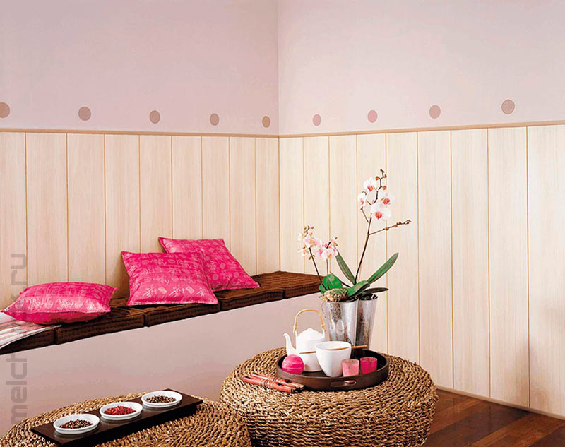 - Dans ce cas, la partie supérieure du mur est décorée de papier peint ou de peinture, comme dans notre exemple, et doit être combinée en couleur avec les matériaux du sol.
