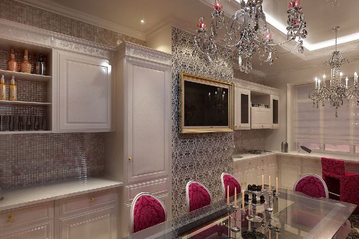 - Dans ce style, vous pouvez même faire une petite cuisine, il est important de ne pas utiliser de couleurs sombres, de finitions massives et de sculptures dans ce cas. Le verre et les miroirs utilisés pour décorer les plafonds et les meubles résoudront le problème de l'extension de l'espace aussi bien que possible.