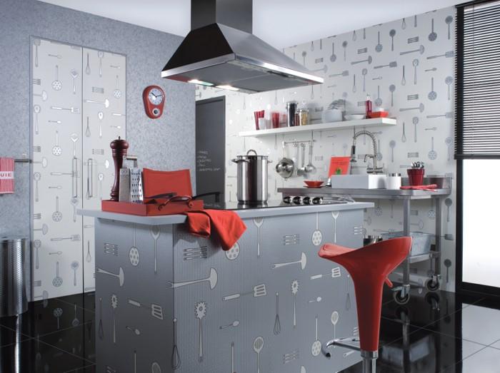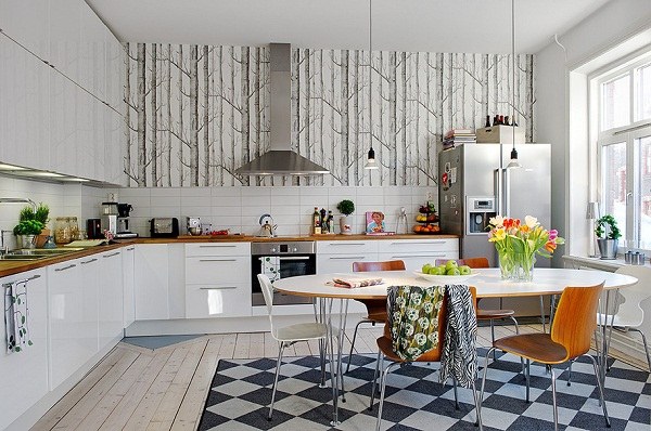 Comme vous pouvez le voir, les papiers peints en vinyle ordinaires avec un motif approprié ont créé la bonne atmosphère dans la cuisine. De cette façon, dans le style techno, même la finition d'une cuisine de 5 mètres peut être effectuée.
