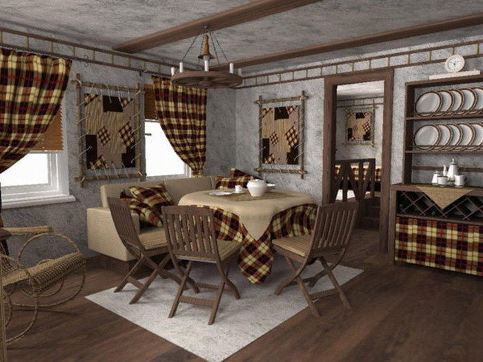 - Le style rustique dans l'interprétation russe, implique l'utilisation de bois naturel dans la décoration des murs et des plafonds, la présence de poutres au plafond. Dans ce style, les murs de la cuisine d'été sont souvent décorés.