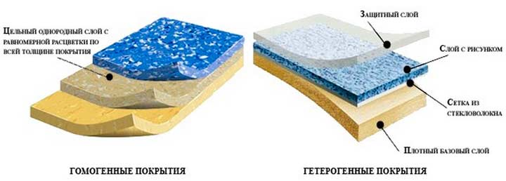 Si le linoléum naturel sur le marché de différents types et fabricants n'est pas trop différent en épaisseur, alors le revêtement en PVC artificiel est clairement divisé en homogène (mince, monocouche) et hétérogène (épais, multicouche).