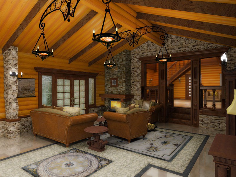Les sols des maisons en bois sont posés sur des rondins, du stratifié, du parquet, du linoléum ou des panneaux massifs, mais la pose de sols d'un poids impressionnant n'est pas souhaitable. Il n'y a pas de restrictions dans la décoration du plafond, il est important d'entrer son aspect dans l'intérieur général. - Les cottages en pierre n'ont aucune restriction, des matériaux naturels et artificiels sont utilisés. Dans tous les cas, l'intérieur du chalet en bois prend en compte le style et les éléments architecturaux.